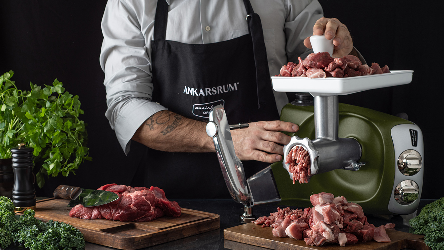 Ankarsrum har naturligtvis också en köttkvarn, som ger dig full kontroll över både kvaliteten och smaken på maten du lagar. Gör köttfärs, korv, fiskkakor, falafel och mycket mer med utvalda kryddor och handplockade ingredienser, samt med önskad grovhet.