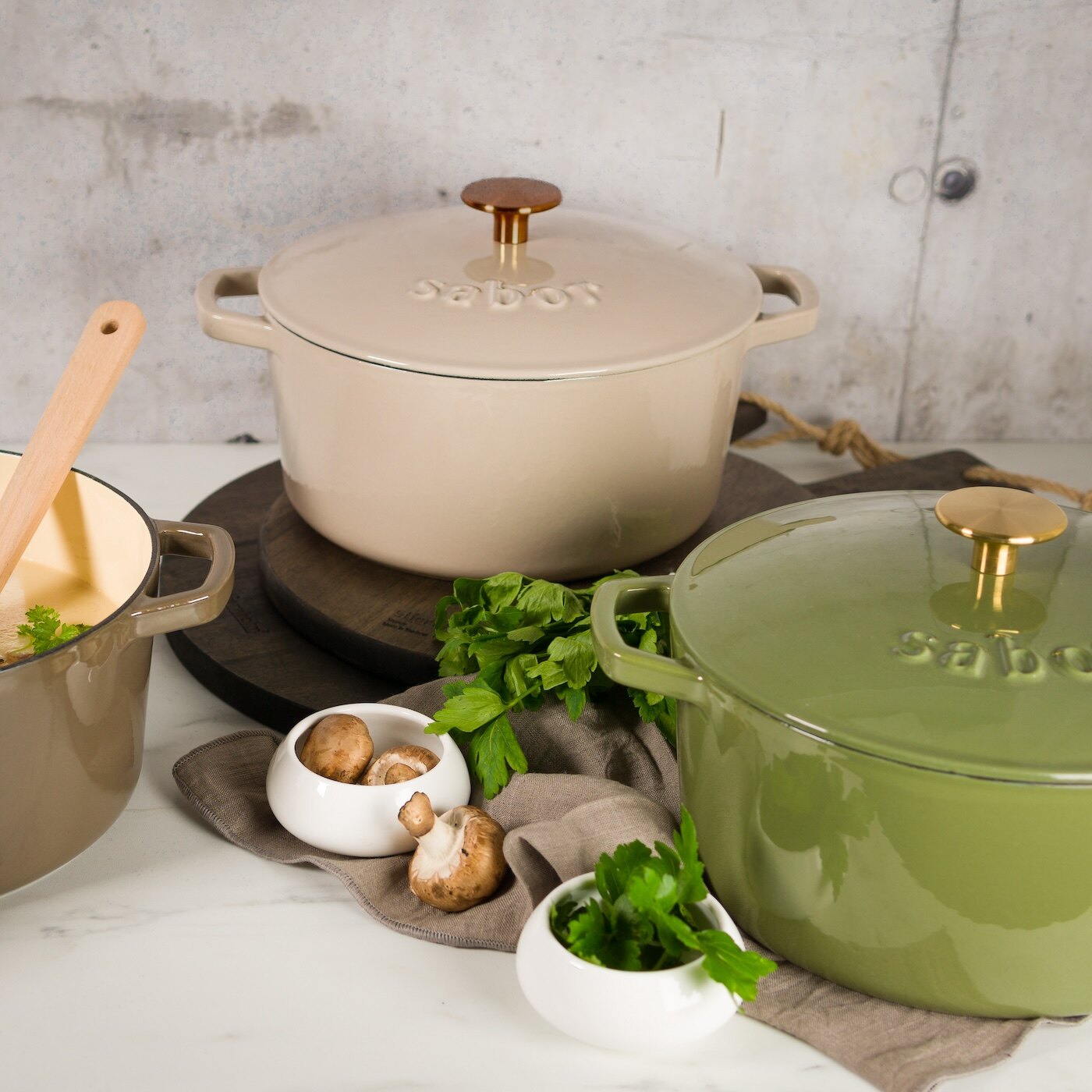 Gjutjärnsgrytorna från Sabor är perfekta för långtidsmatlagning, grytor och grytor, tack vare deras förmåga att hålla och fördela värmen jämnt. För bästa resultat bör de användas med trä- eller plastredskap för att skydda emaljen och rengöras för hand med varmt tvålvatten efter kylning.