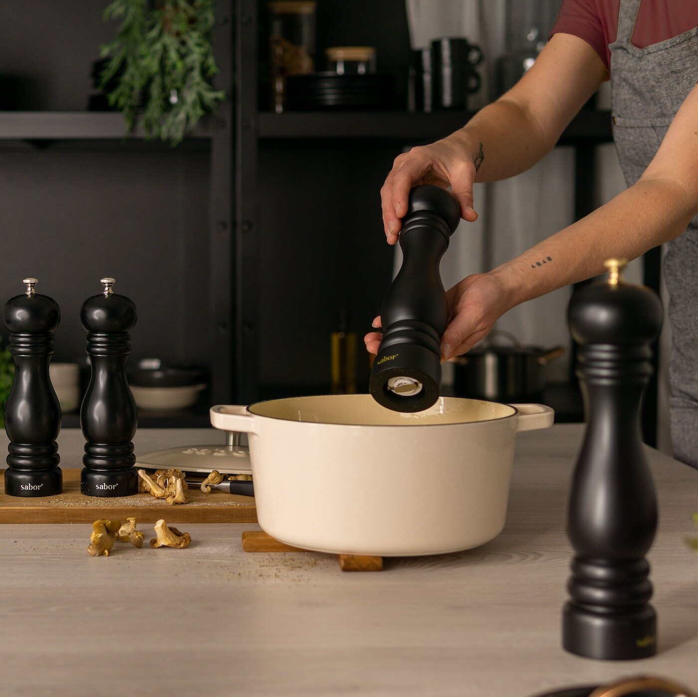 Salt- och pepparkvarnarna från Sabor är funktionella och användarvänliga. Med justerbar malningsgrad och enkel påfyllning är de ett bra val för exakt smaksättning, oavsett om det gäller grova eller finmalda kryddor.