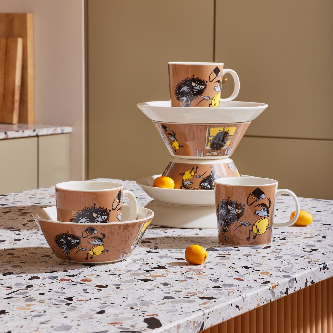 Detta gör det enkelt att kombinera både de enkla kopparna, skålarna och faten från Teema, tillsammans med Muminkopparna och porslin med motiv från Muminvärlden.