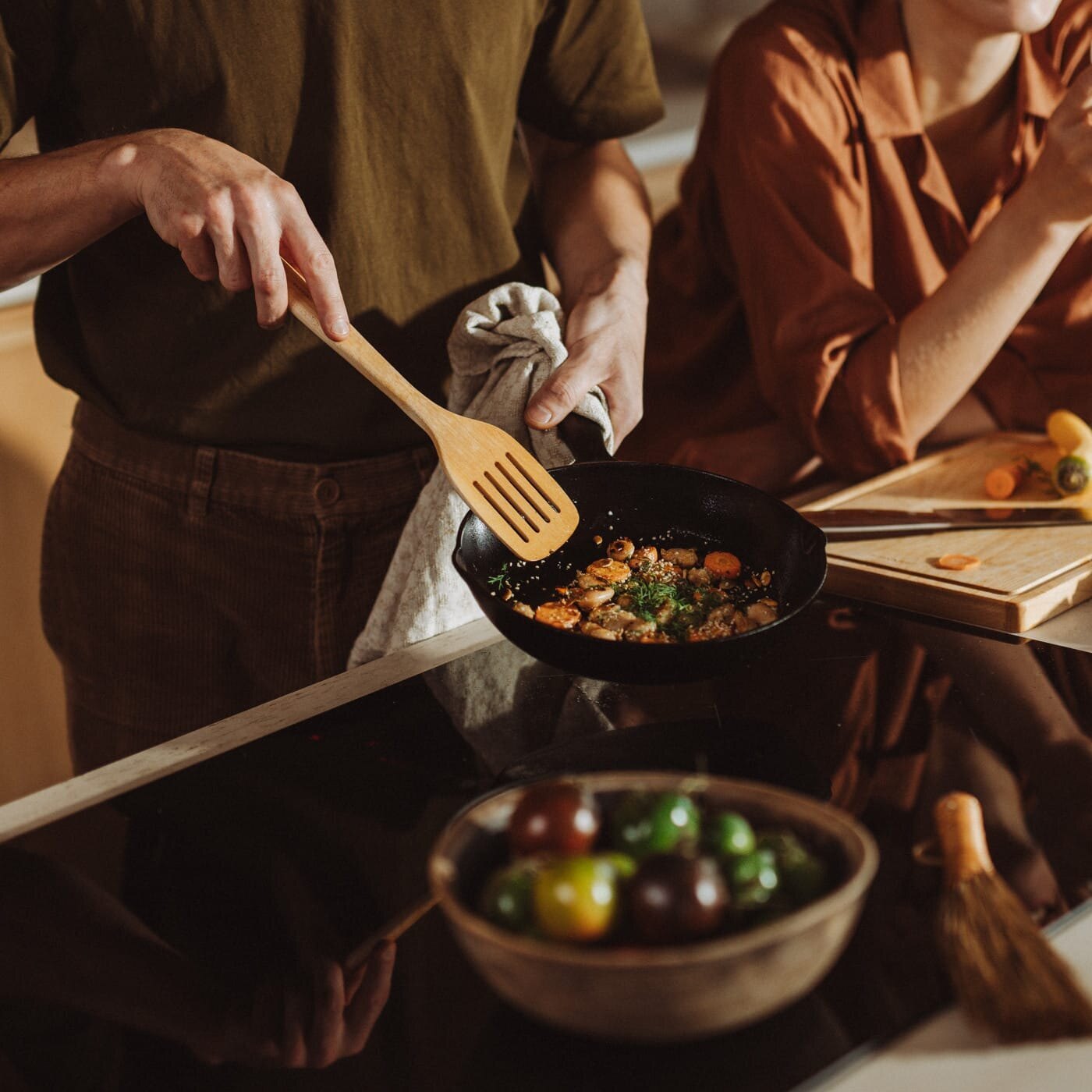 I stället för att dra på för fullt – värm upp pannan gradvis. De flesta stekpannor trivs bäst på medel till medelhög värme, inte på max. Då får du jämnare stekning och bättre kontroll.