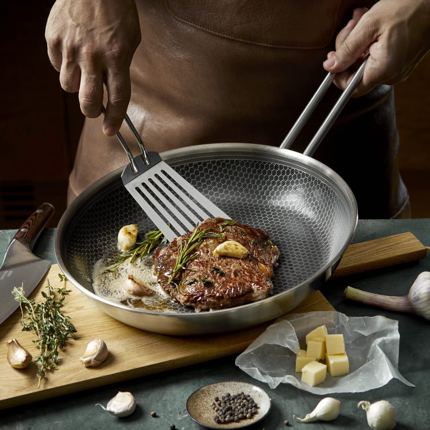 - I obelagda stål- eller kolstålspannor – var generös med fettet för att undvika att maten bränner fast.
